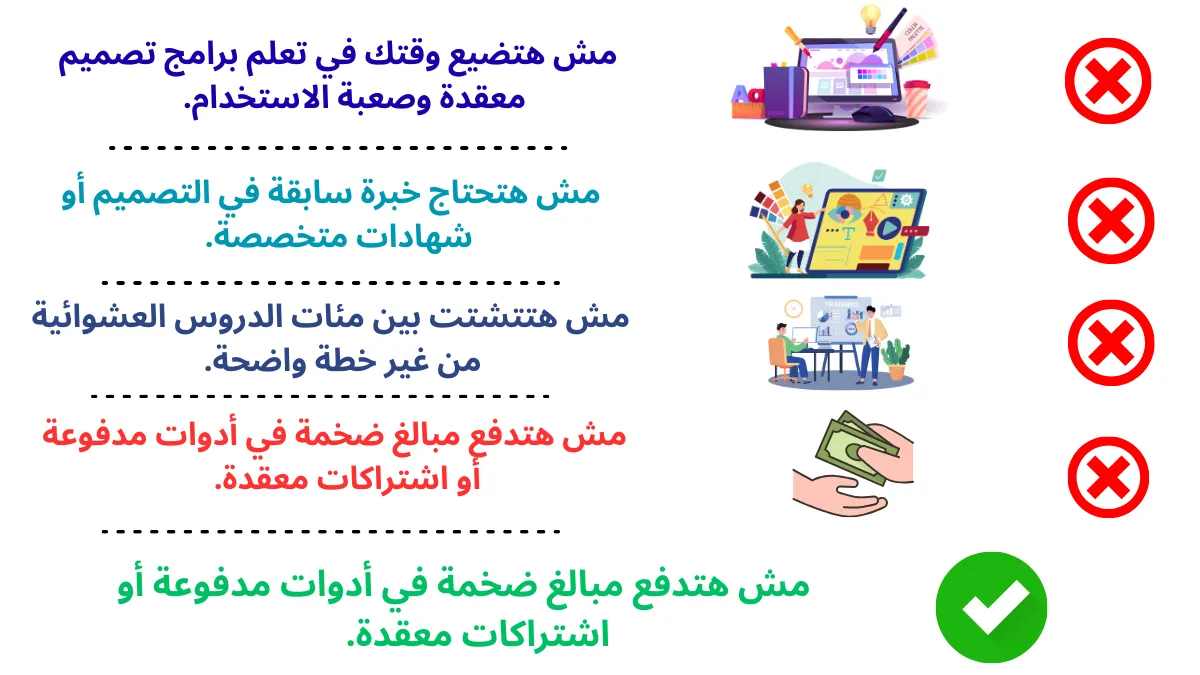 يجربوا يتعلموا برامج معقدة، ويضيعوا شهور طويلة بدون ما يطلعوا شغل احترافي…
